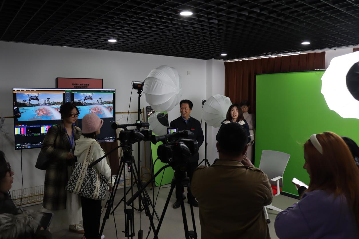 在参观过程中,副院长荣斌等向嘉宾们介绍了我院全媒体中心的建设情况,及我院在教育教学方面的基本情况、发展思路以及取得的成果,详细讲解了直播带货、短视频创制、XR交互、曲面屏主播台、虚拟演播、动捕驱动虚拟数字人、融媒节目创制等具体应用知识和操作,并与嘉宾们就影视传媒教育的发展、影视传媒教育领域的实践经验和研究成果,及未来创新路径和发展方向等方面进行了深入交流。