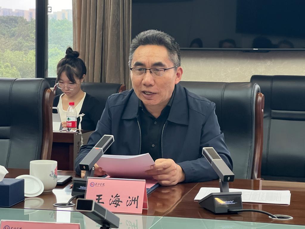 阳王东副校长在致辞中对王海洲教授的到来表示热烈欢迎和感谢。他指出,学校正在奋力落实“三升三大”发展战略和目标任务,我校今年已被国务院学位委员会批准为硕士学位授予单位。近年来,马栏山新媒体学院坚持“文化和科技融合”办学发展方向,推动戏剧与影视、设计学、计算机科学与技术等多学科交叉融合,在音视频科研团队、科研平台、科研成果等方面均取得新成效和新提升。当前,我校正在积极搭建“文化+科技”融合类人才培养和科学研究平台,全面提升学校音视频相关学科专业实力。