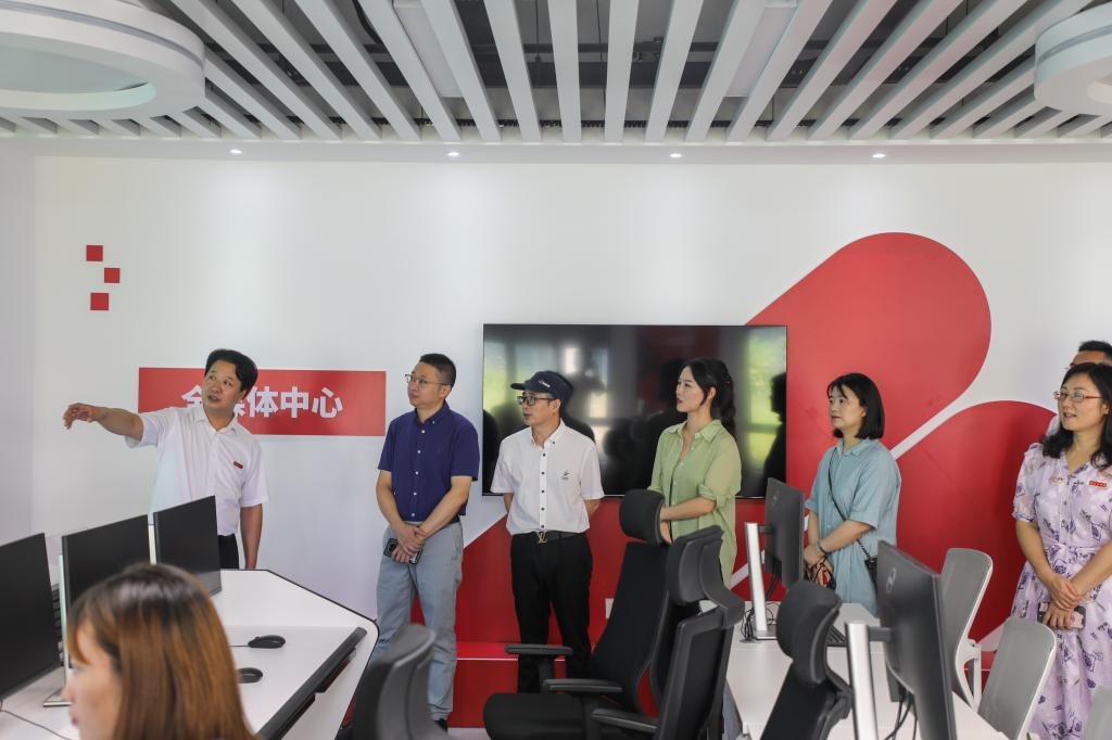 江勇一行在我院全媒体实验实训中心的短视频工厂和全媒体中心,参观了新媒体内容采集实训区、数字直播实训区、新媒体制作创新实训区、多屏互动实训区、虚拟交互实训区、XR交互实训区、导播实训区、融媒体传播实训区等8个功能实训分区,并实地观看了我院学生直播带货、多屏虚拟交互、融媒体新闻制作发布等现场实训。