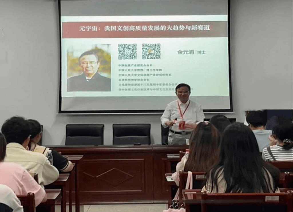 5月19日,中国人民大学博士生导师、中国创意产业研究会会长金元浦教授应邀来我院作题为《元宇宙:我国文创高质量发展的大趋势与新赛道》的学术讲座。本次讲座由谭文鑫教授主持,副院长荣斌、张乃午及马栏山新媒体学院师生共计100余人参加了此次讲座。