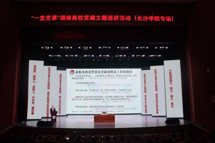 4月18日下午,长沙市广播电视台(集团)副书记、副台长、副总编辑、总经理潘开政在我校大礼堂讲了一堂《做马克思主义新闻观的追随者践行者》的党课,校党委宣传部常务副部长徐远超主持本次党课,马栏山新媒体学院(影视艺术与文化传播学院)党总支书记徐长梅、马栏山新媒体学院(影视艺术与文化传播学院)院长黄柏青、副书记叶佳、副院长荣斌、张乃午,党员教师代表、辅导员以及马栏山新媒体学院全体学生参加活动。