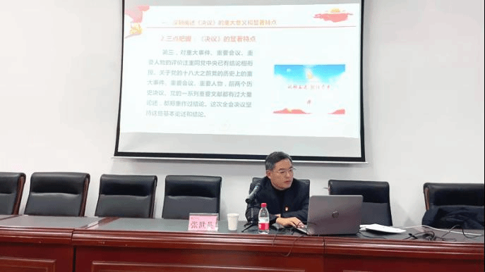 宣讲会上,张世英紧扣《中共中央关于党的百年奋斗重大成就和历史经验的决议》,作了《百年风华启新程以史为鉴创未来》的专题辅导。他阐述了《决议》的重大意义、党百年奋斗的光辉历程和辉煌成就、党不断推进马克思主义中国化的百年历程、“两个确立”的极端重要性、新时代历史性成就和历史性变革、党的百年奋斗历史意义和历史经验。他指出,《决议》对党的百年奋斗的伟大成就、历史经验进行了全面深刻的总结,贯通历史、现在、未来,具有重大历史意义和时代价值,是党为实现中华民族伟大复兴接续奋斗的伟大政治宣言和科学理论指南。