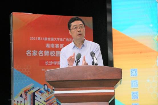 5月18日下午,由全国大学生广告艺术大赛(以下简称:大广赛)湖南赛区组委会主办、我校承办的第十三届大广赛湖南赛区名家名师校园创意巡讲活动在学院力行楼演播厅顺利开展。校教务处处长杨建宏教授,湖南师范大学王战教授,华侨大学硕士生导师江绍雄教授以及大广赛五大品牌商负责人出席本次巡讲。