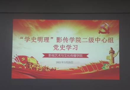 2021年3月25日上午八点半,影传学院在力行楼A204室,开展了“学史明理”学院二级中心组党史学习,院党总支书记胡嫔主持会议,院长黄柏青、副院长荣斌、副书记王艾红、副院长谭文鑫、教工和学工党支部书记、教工支部组织委员参与会议。
