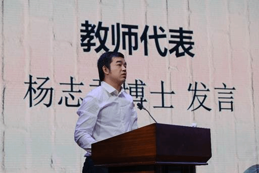 然后是教师代表杨志君博士发言,他结合自己的人生经历,勉励新生们要明确自己人生的目标,并为之不懈努力,提倡多读几部经典名著,让自己成为一个有人文底蕴的人、发展一两种兴趣爱好,让自己成为一个有趣的人、坚持体育锻炼,让自己成为一个有活力的人。