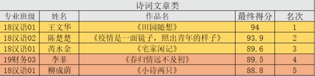 此次活动于5月3日开始启动线上报名,截止至15日,共收到来自全校的84个作品。其中,诗词文章类25个、Vlog32个、美术作品类27个。其中既有同学们对抗疫英雄的歌咏,也有居家丰富生活的展示,既有细腻的文字,生动的图画,也有新颖的短视频。最终,在专业评委的评议下,活动共选出15个优秀作品并将在学院微信公众号上进行展示。