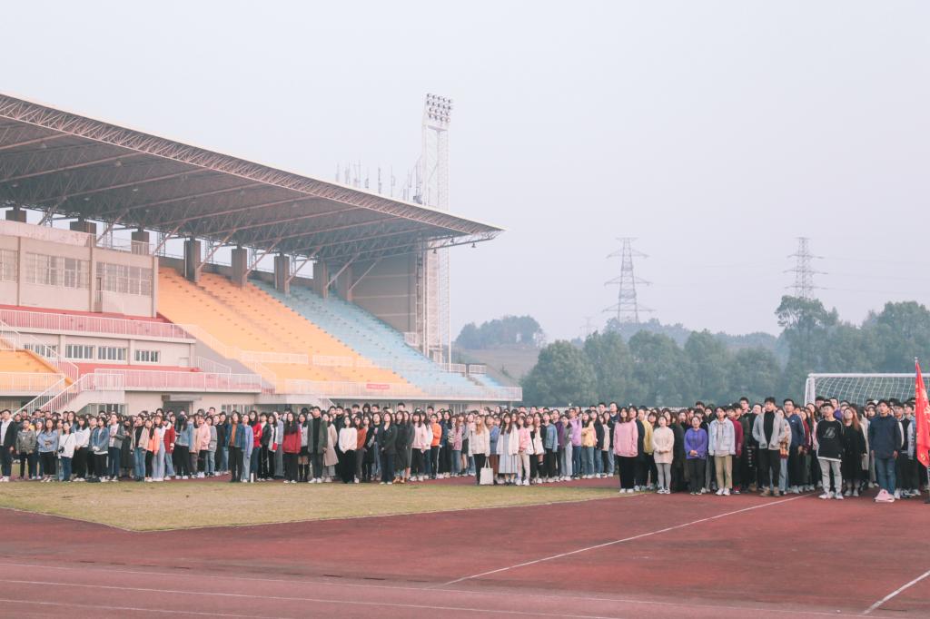 2019年11月4日早7时,迎着深秋清晨的第一抹阳光,影视艺术与文化传播学院于天健体育场举行了2019-2020学年第一学期升旗仪式,影传学院党总支书记胡嫔、副书记王艾红、团总支书记刘敏、18级辅导员盛洁与19级辅导员谭凤连,及影传院17、18、19级全体同学参加了本次升旗仪式。仪式由来自18级播音专业的平川主持。