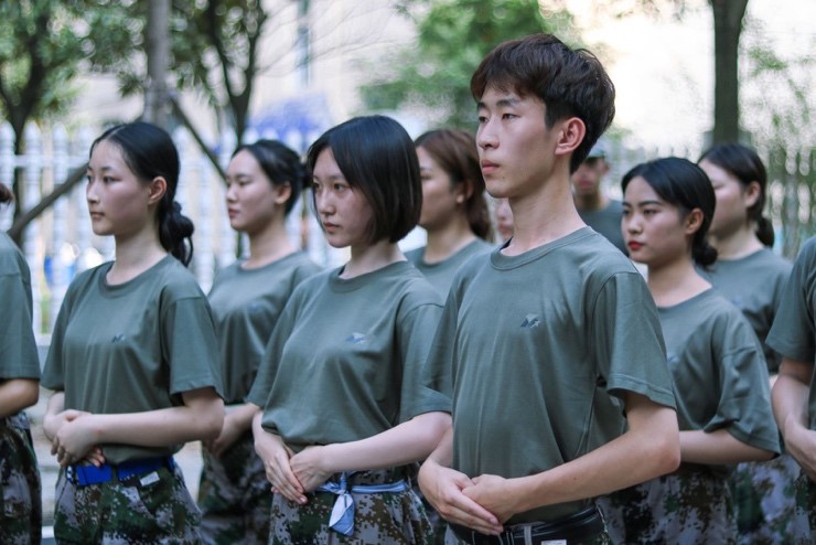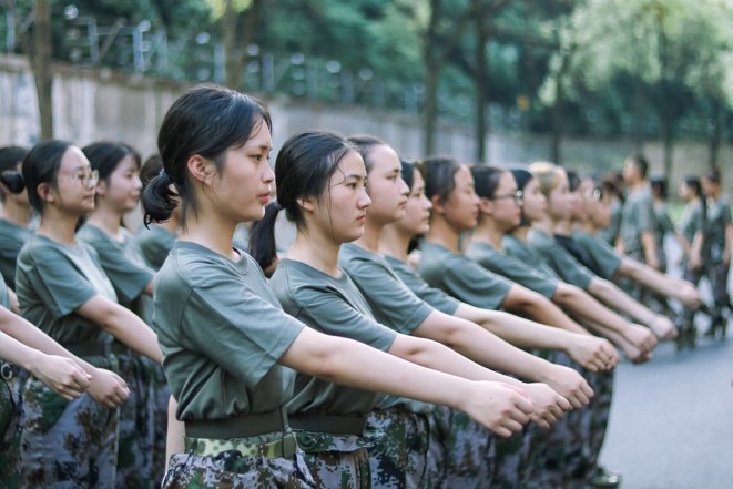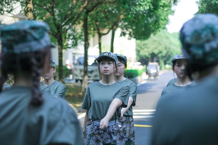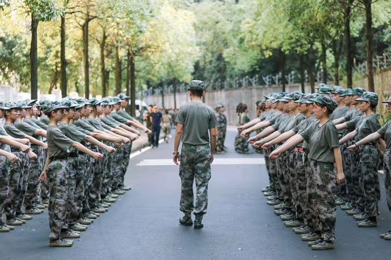 一次次的整改重来也没有听到新生们的抱怨。他们在烈日下,训练服汗湿一遍又一遍,却仍在咬牙坚持。为了集体荣誉,为了让整个队伍更整齐、精益求精,他们不言苦,不喊累,在日复一日的训练中磨炼自己。