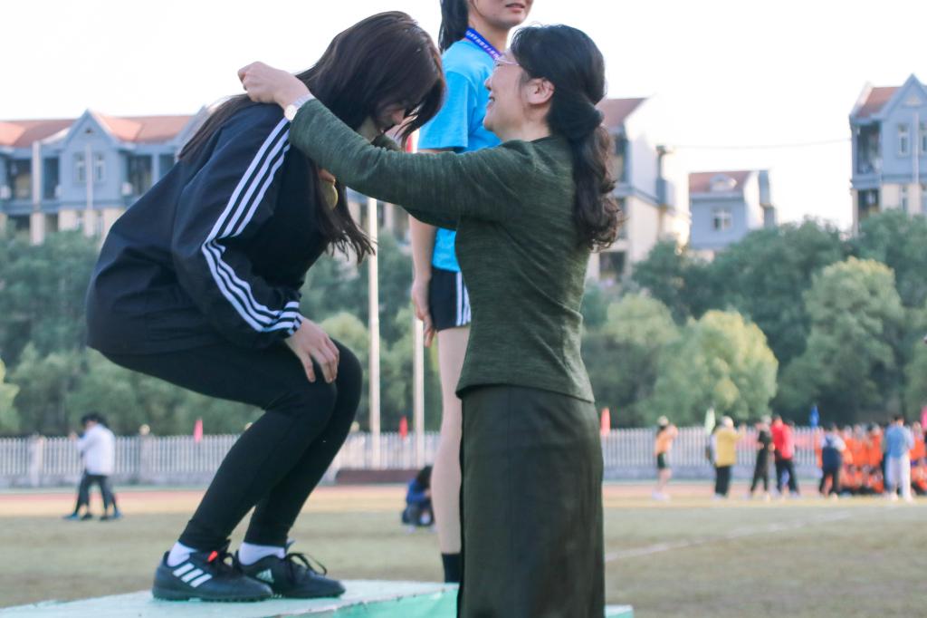 (胡嫔书记为获得女子跳远第一名的余奕青同学颁奖)