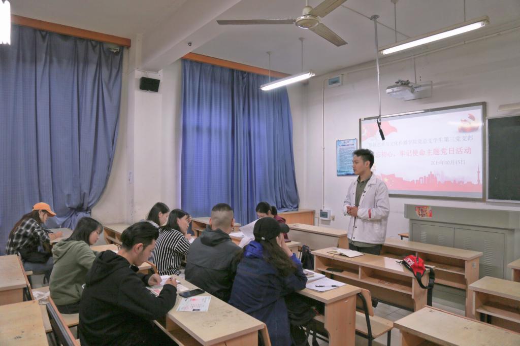 2019年10月15日下午两点十分,影视艺术与文化传播学院党总支学生第三党支部在涵虚楼B2401教室组织党员开展以“担使命,履职责,矢志为民服务”为主题的党日活动。本次会议由影传院团支部书记刘敏老师主持,与会人员应到8人,实到7人。