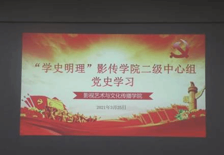 2021年3月25日上午八点半,影传学院在力行楼A204室,开展了“学史明理”学院二级中心组党史学习,院党总支书记胡嫔主持会议,院长黄柏青、副院长荣斌、副书记王艾红、副院长谭文鑫、教工和学工党支部书记、教工支部组织委员参与会议。
