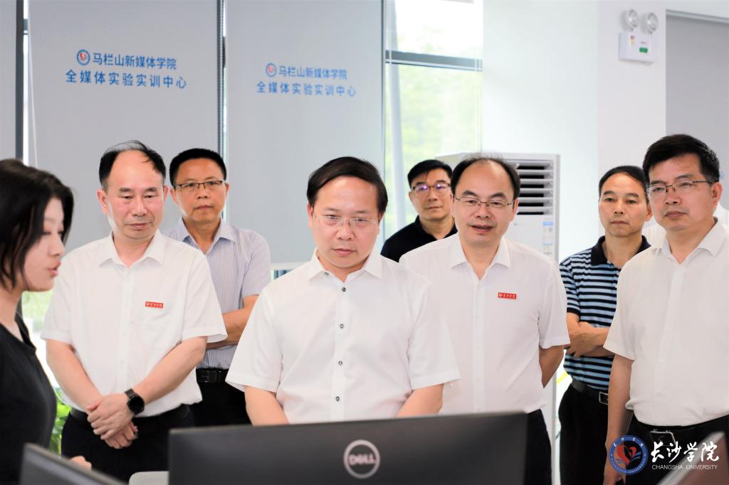 5月30日,长沙市人民政府党组成员、副市长肖正波一行到我校考察调研。长沙市政府副秘书长王新良,市教育局、市发改委、市财政局、市自然资源规划局、市住建局、开福区政府、马栏山视频文创园等相关单位负责人,学校全体校领导及相关处室负责人陪同调研并参加座谈。