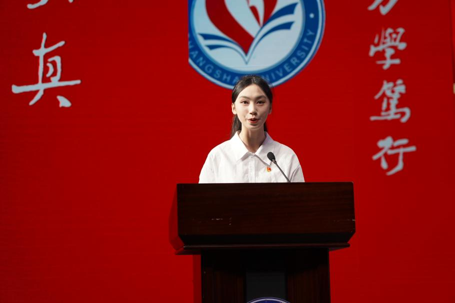 来自24汉语2班的新生代表贺林晓芙对大学时光满怀憧憬与期待,她结合自己的经历与思考,向同学们分享了对专业学习的看法,并呼吁新生们要勇于实践,敢于探索,将“专业武器”磨砺得更加锋利。