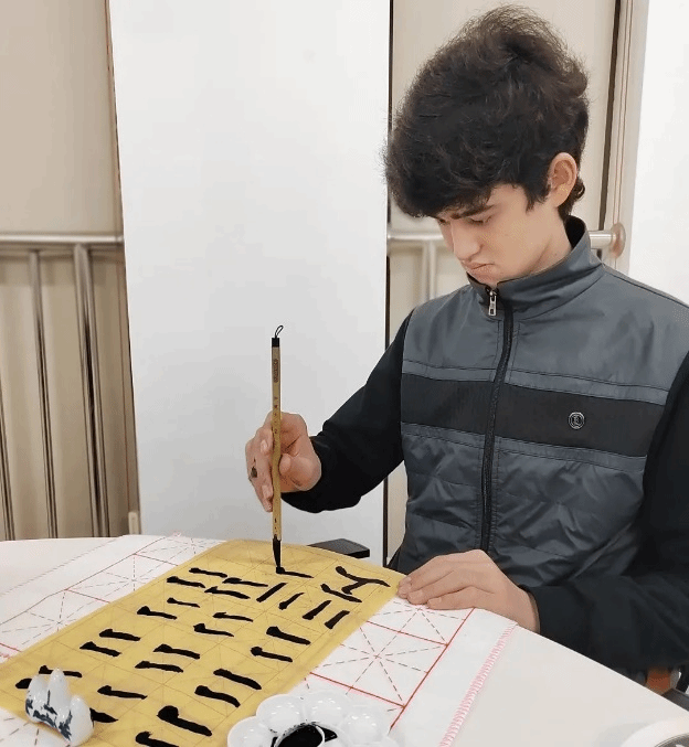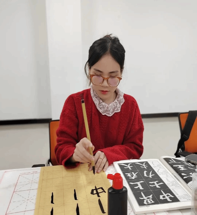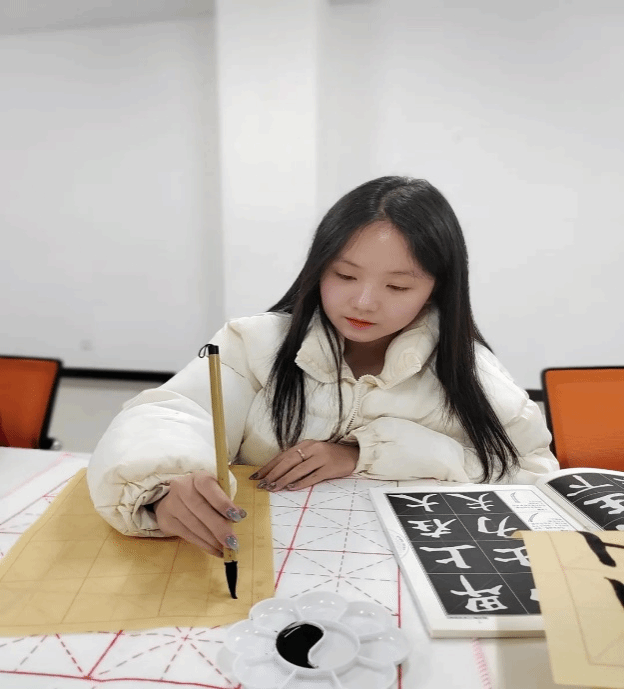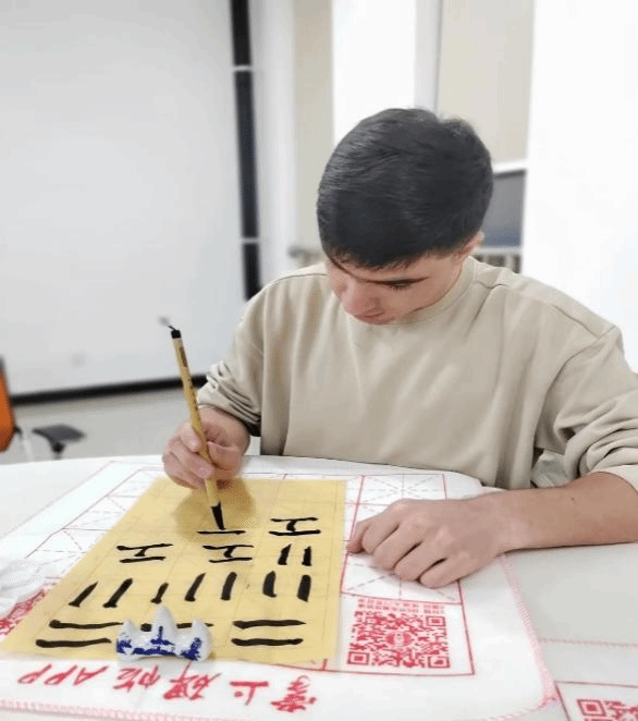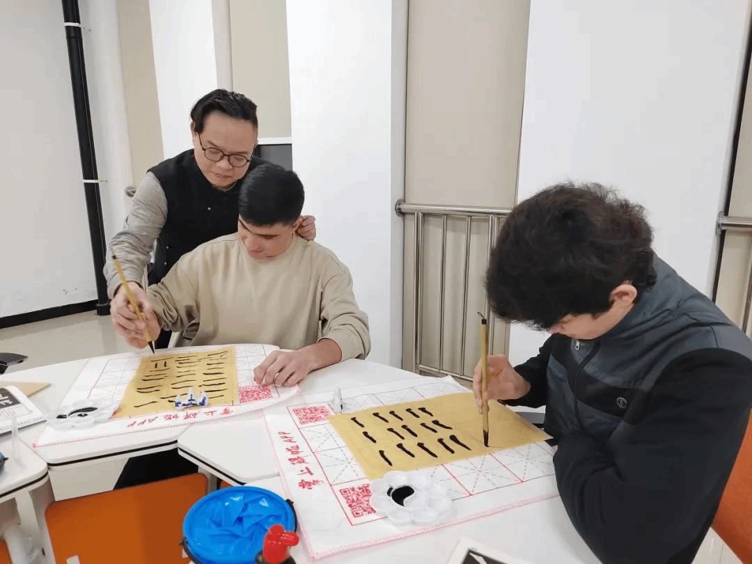 首先,卿老师展示了一些经典的书画作品,让留学生们直观地感受中国书画的韵律和美感,激发大家的学习兴趣。接着,逐一介绍了学习书画所需用到的笔、墨、纸、砚等材料,并现场演示。卿老师详细讲解了坐姿、握笔、蘸墨、运笔方式等,鼓励留学生们拿起笔,从书写汉字的基本结构、偏旁部首入手,逐步尝试运笔的方法,并对他们的课堂作业进行了点评。