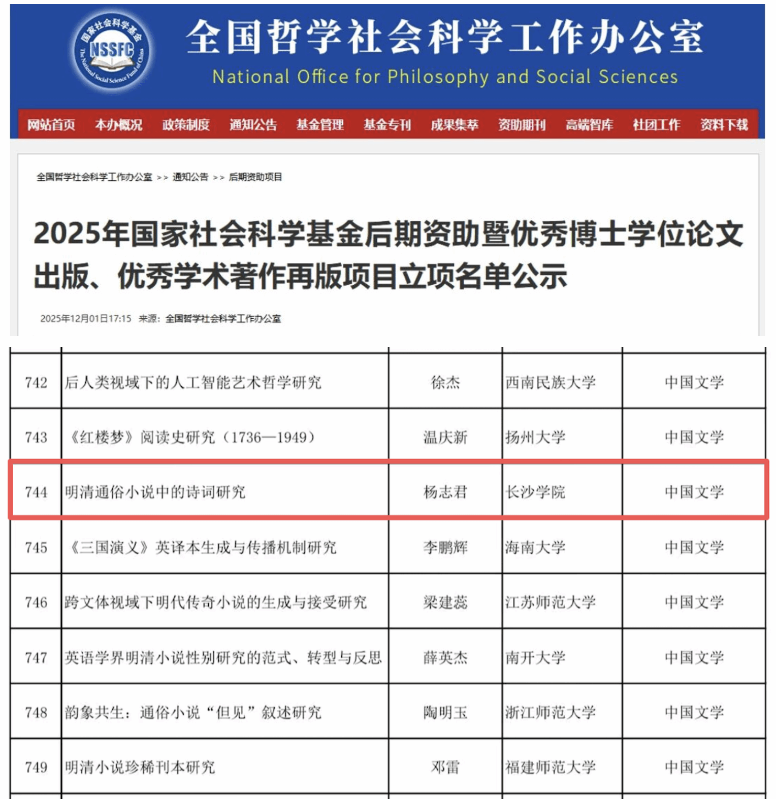2025121日,全国哲学社会科学工作办公室公布了2025年度国家社会科学基金后期资助暨优秀博士学位论文出版、优秀学术著作再版项目立项名单,我院杨志君副教授申报的《明清通俗小说中的诗词研究》成功获批立项。这是我院近5年来获批的第7项国家社科基金项目,体现了我院教师扎实的研究能力和创新水平。