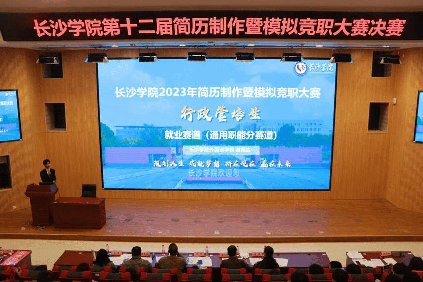 为引导广大学生树立正确的就业观,提高我校学生的综合素质,12月7日晚七点,由招生与就业指导处联合教务处、校团委“金桥行动”共同举办的第十二届“简历制作暨模拟竞职大赛”决赛于图书馆二楼报告厅顺利开展。本次比赛对接首届全国大学生职业规划大赛,分为成长、就业、行政能力三个赛道,邀请了我校体育学院院长邓晖、科技处副处长付卓、美的集团HRBP黎禹翔、湖南长广千博科技有限公司商务总监文静、考德上教育面试研究院院长朱飞翔、中公教育培训教师袁巧作为评委嘉宾。
